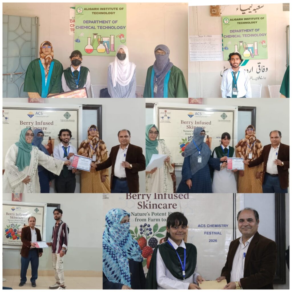 Students of Aligarh Institute of Technology delivered an exceptional performance at the Chemistry Festival “Innovation and Creativity 2026”, organised by the Department of Chemistry at Federal Urdu University of Arts, Science and Technology (FUUAST). Demonstrating remarkable scientific insight, creativity, and entrepreneurial vision, the students earned distinguished recognition at the university level.